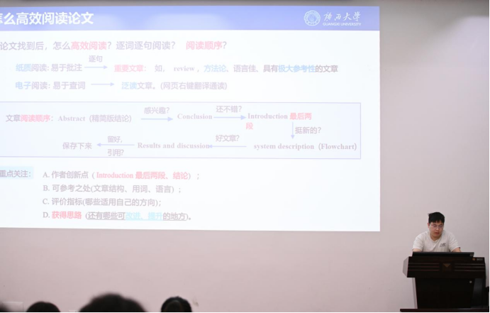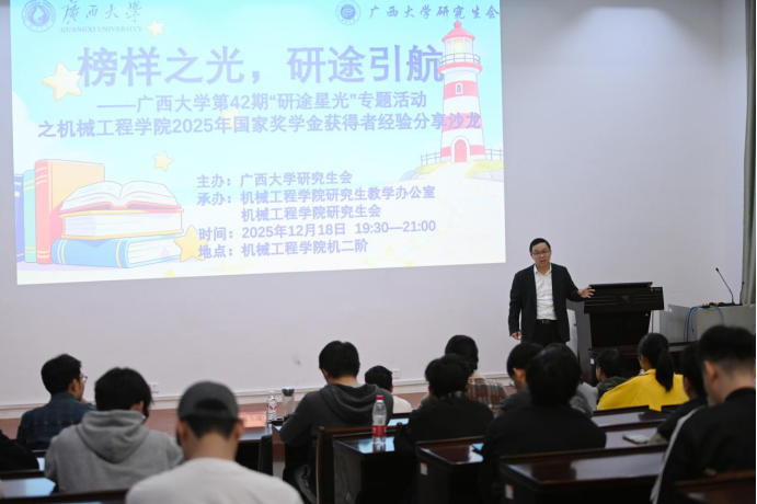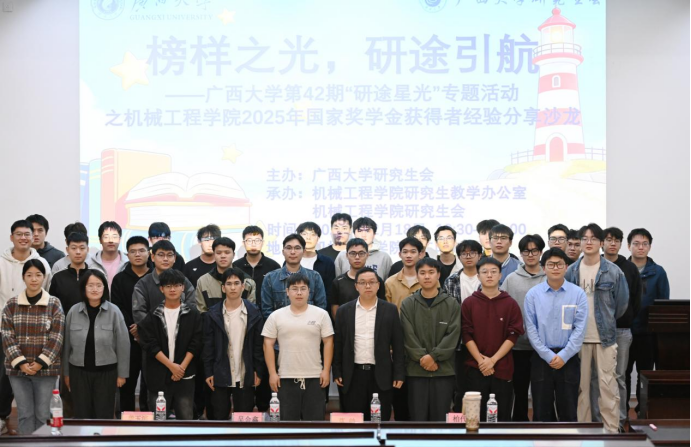 12月18日,由校研究生会主办,我院研究生会承办的广西大学第42期“研途星光”主题沙龙活动在机二阶教室举行。本次活动邀请了学院2025年研究生国家奖学金的获得者、博士研究生吴金鑫、柏代鑫、龚玉滨,分别围绕科研规划、论文写作、求职技巧及工作平衡等方面进行经验分享。学院分管研究生副院长莫帅受邀出席活动并作指导。