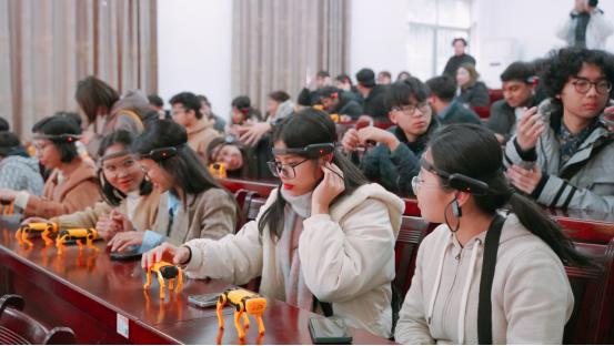 通过前沿科技展示与沉浸式实践体验,向在校来华留学生生动展现中国制造与科技创新的发展成果。在机械工程学院专业教师与学生志愿者的引导下,留学生们依次体验了四大核心科技项目:在智能车间,他们近距离观摩了现代化智能制造生产线的高效与精密;脑机接口技术体验区更是亮点频现,留学生们亲身体验了如何通过“意念”控制机械狗行走,对人工智能与人类认知的融合发出了阵阵惊叹;在3D打印工作坊,每人亲手参与制作并带走了一份独特的科技纪念品;而在自主编程挑战环节,大家积极尝试编写代码,成功实现了声控小车的现场操控。一系列互动性强、科技感足的活动设计,让留学生们在动手实践中深化了对人工智能、先进制造等前沿领域的认知。
